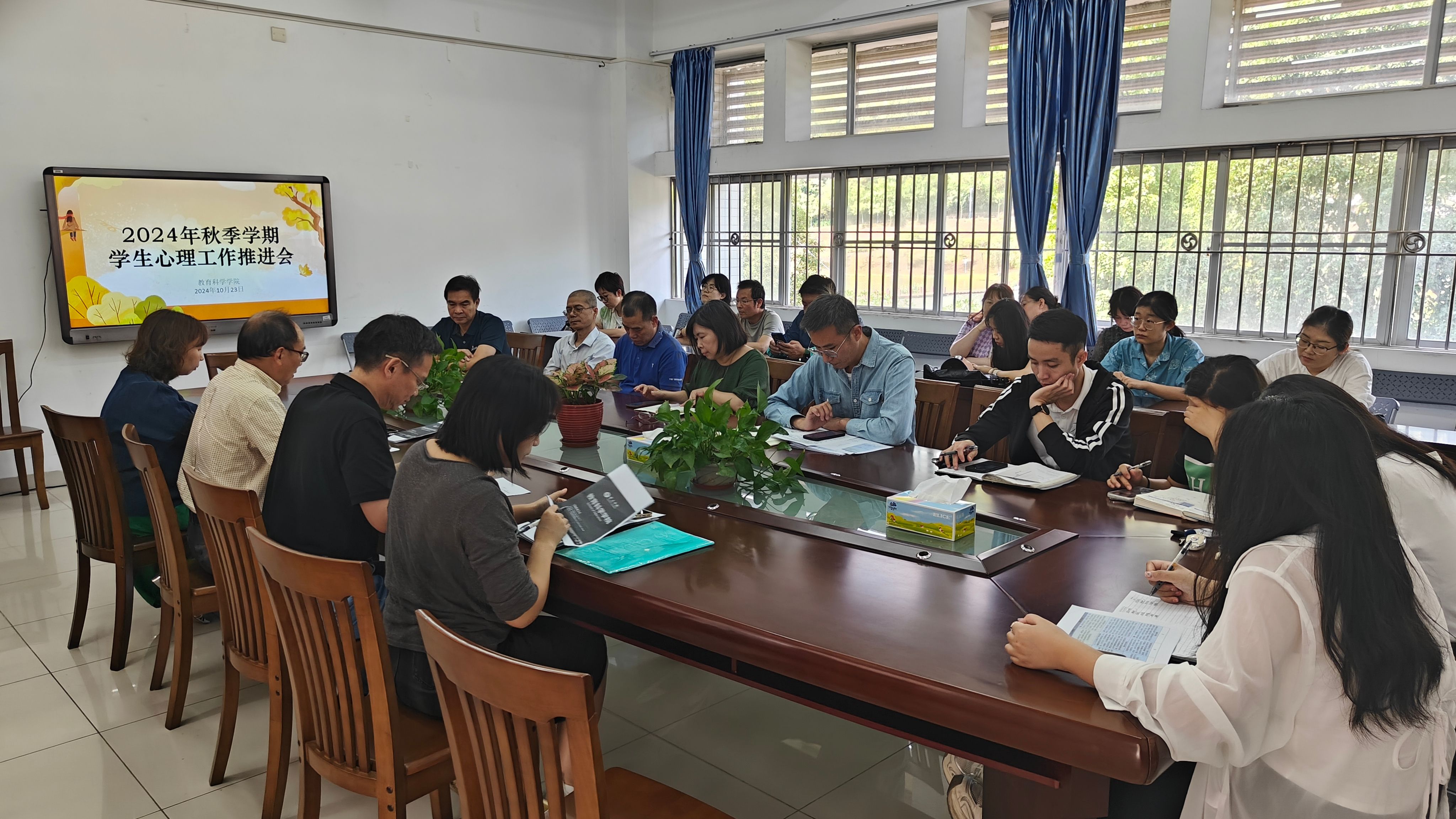 为进一步加强大学生心理健康教育工作,全面了解学生心理状况,及时发现和解决学生心理问题,教育科学学院于 2024 年 10 月 23 日召开2024年秋季学期学生心理工作推进会。学院领导相关班主任、全体辅导员参加了此次会议。