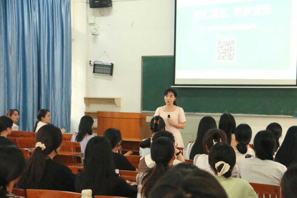 会上,深圳市宝安区西乡南昌第二幼儿园园长宫艳秋全面介绍了深圳宝安区教育的现状以及未来发展趋势,内容涵盖地理位置、宜居环境、发展前景、教育机制以及教师职业规划等多个方面。同时,深圳市幼儿教育管理中心园长杨瑞冰详细阐述了深圳市宝安区幼儿教育行业的薪酬结构及福利待遇,并针对应届毕业生普遍关心的实际问题进行了详尽解答。宣讲会现场气氛热烈,同学们积极参与,纷纷结合宣讲内容进行深入交流并提问。此次宣讲会使同学们对深圳宝安区幼儿教育有了更加全面深入的了解,为接下来的应聘求职奠定了坚实的基础。