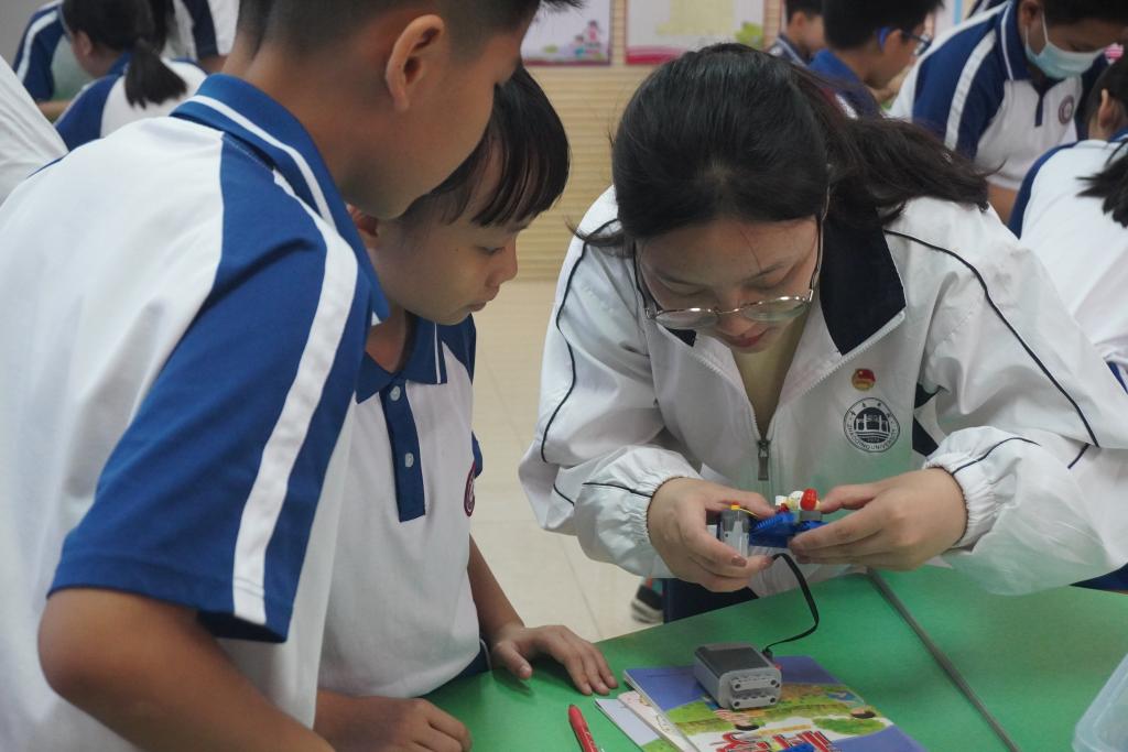 活动中,周琼笑同学为肇庆市第四小学25名五年级学生讲授了“智能机器人之稻草人”一课。本次公益课包含趣味十足的导入环节、直观生动的“曲柄摇杆”原理讲述和大小同学携手搭建智能机器人的实操过程。