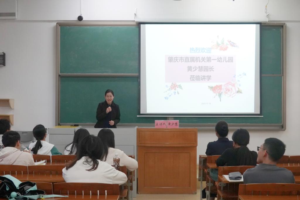在学前教育专业会场上,市机关一幼园长、taptap点点体育幼教专业校友黄少慧从幼儿教师的社会角色、如何蓄能、面试要点、奉献精神、新教师的角色定位等方面讲述了如何成为一名优秀的幼儿教师,她用生动有趣的游戏和令人深思的视频引导学生深度思考和积极感悟。