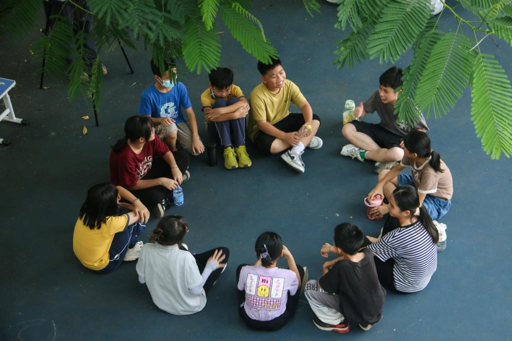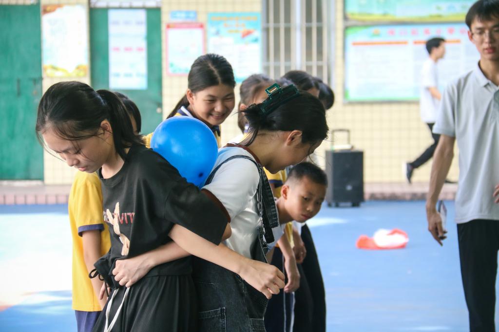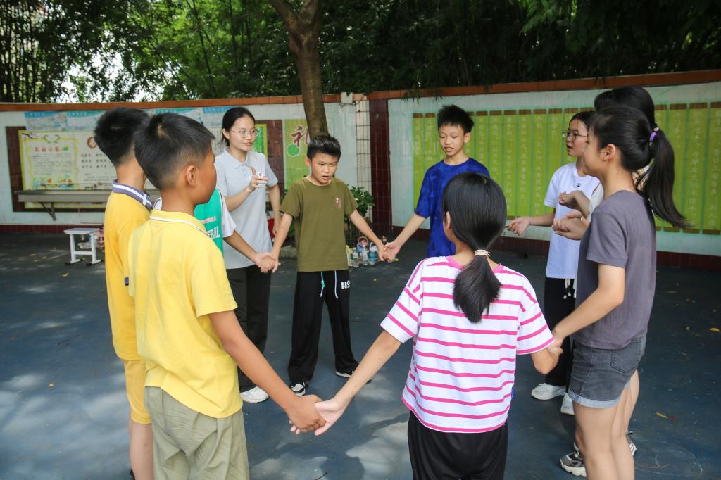 仪式结束后,为建立志愿者与小学生的良好关系,提高学生们的团队凝聚力和抗压能力,志愿者们引领小学生们开展破冰活动。破冰活动包括多项小组游戏,如突破重围、老师说、解手链、你比划我猜等。通过相处与观察,志愿者们在活动中与学生们建立了更加牢固的信任关系,为后续的教学和实践任务奠定了良好的基础。