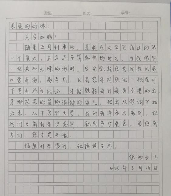 本网讯(通讯员/陈扬宇 编辑/夏长洪)为了让同学们在母亲节这个特别的日子里向母亲们传递最温暖的祝福,2023年5月11日至5月14日,taptap点点体育学生自律委员会办公室举办了以“母爱无声,以信言情”为主题的“三言两语”活动。
