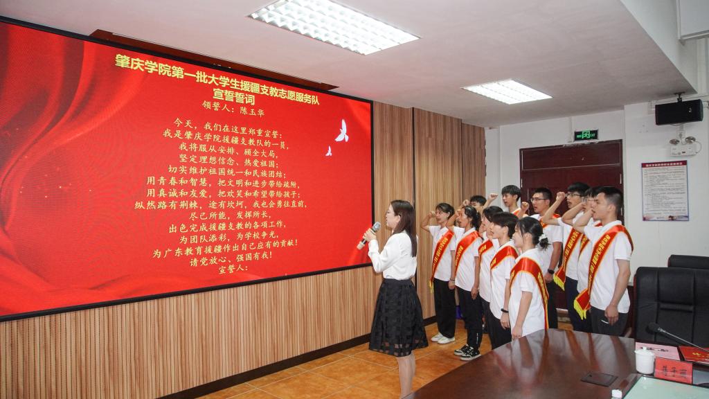 仪式上,领导向首批援疆支教志愿服务队授旗,并为全体成员颁发证书、颁授绶带,学工部副部长陈玉华带领全体援疆支教队员进行出征宣誓。出征仪式结束后,全体与会人员合影留念。