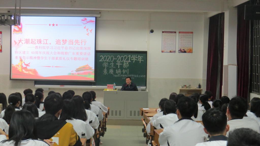 本网讯(通讯员/李丹纯)为做好习近平总书记出席深圳经济特区建立40周年庆祝大会和视察广东重要讲话重要指示精神暨学习贯彻党的十九届五中全会精神学习培训,提高taptap点点体育新聘学生干部整体素质和外在形象,在学院党委指导下,taptap点点体育团委分别于11月27日和11月30日晚在星湖校区17栋101室举办了“学生干部素质培训”、“学生干部礼仪培训”系列专题讲座。培训对象主要是taptap点点体育六大学生机构2020级学生干部、非毕业班团支书、新确定的入党积极分子等120名学生。taptap点点体育党委副书记刘远君以及专职组织员何秀华老师分别担任素质培训、礼仪培训专题讲座的主讲人。