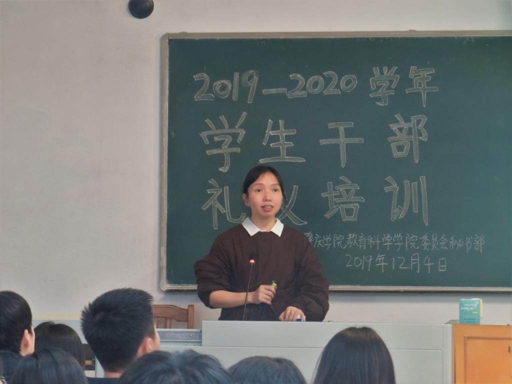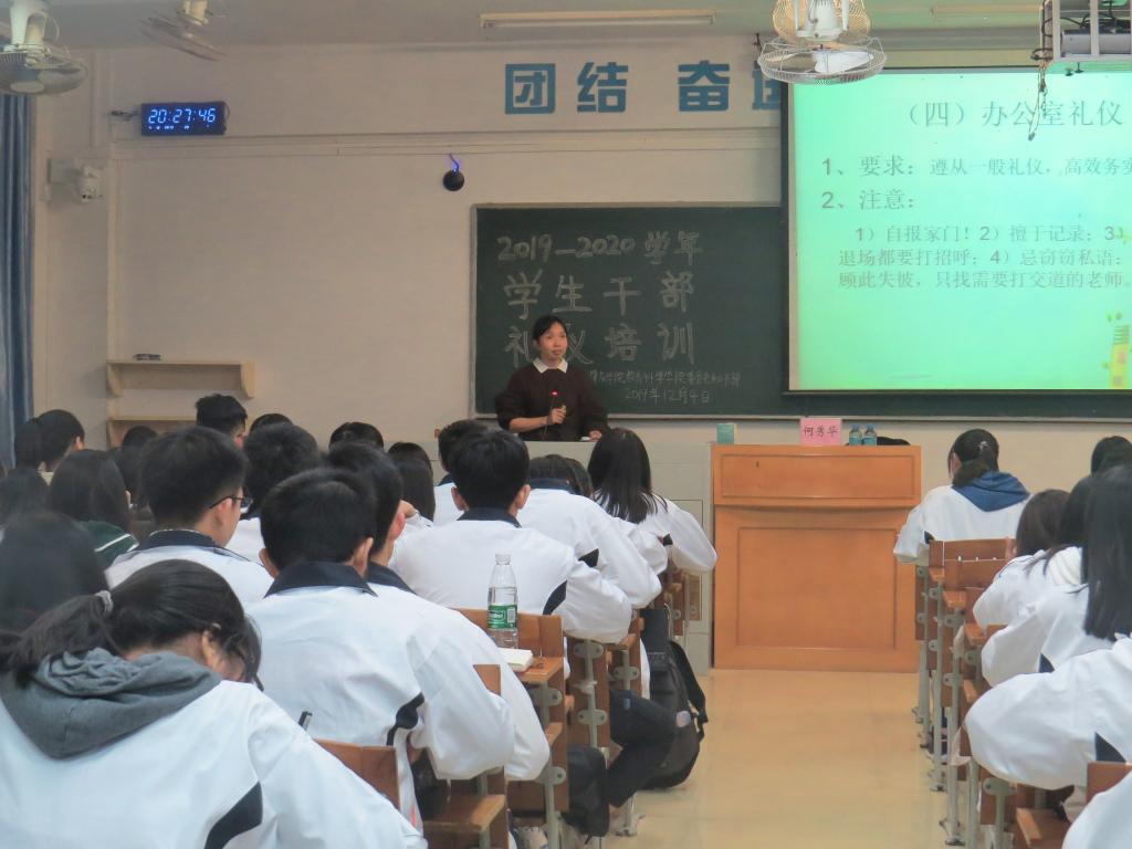 本网讯(通讯员/黎敏思 詹妮 拍摄/吴漫旋 责编/刘瑞雪)为提高taptap点点体育学生干部的礼仪素养,taptap点点体育于2019年12月4日19:30在第二教学楼605室举办“2019-2020学年学生干部礼仪培训”专题讲座。学院专职组织员何秀华为本次培训讲座的主讲人。辅导员兼团委书记刘瑞雪、2019级各班团支书及六大学生机构的2019级学生干部共123人出席本次讲座。