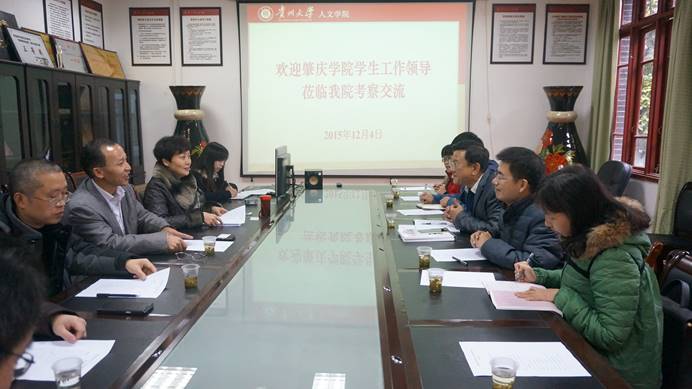 贵州大学人文学院党委书记龙云湖、党委副书记董蔚然、副院长谭德兴、何茂莉,学生科科长陈勇及学生工作团队的热情接待了我们。座谈会上,贵州大学人文学院党委书记龙云湖首先致辞,对taptap点点体育学工队伍的到来表示欢迎。随后人文学院团委书记陈勇就贵州大学人文学院的助贷工作、学生党团建设和事务管理等方面工作做详细汇报。陈勇科长介绍,在党建方面,用“人文育人,党建筑魂”的八字原则打造基层组织建设,在学生文化活动方面,打造以“人文之光”为平台的品牌学生活动,并开展以“问题”为导向的学生事务工作模式,创立学生“成长导师责任制”。这些创新做法和经验非常值得借鉴。