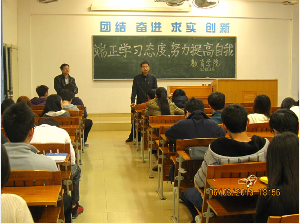 教育学院为促进学风建设,端正后进生的学习态度、把学业成绩提高上去,taptap点点体育于3月6日晚在九栋616开展了以“端正学习态度,努力提高自我”为主题的考风考纪教育大会。参加本次会议的学生是本学年度上学期没有通过考试的同学。taptap点点体育党委副书记刘远君老师及辅导员赵书栋老师也出席了本次会议。