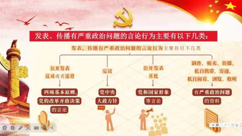 会议伊始,小学教育专业学生党支部副书记黄鸿杰带领全体同学一起学习《中国共产党纪律处分条例》第二编《分则》第六章部分内容,强调党员要在日常生活中规范自己的言行,自觉遵守政治纪律和政治规矩,时刻保持清醒的头脑,切实提高政治站位,做到知敬畏,存戒惧,守底线。
