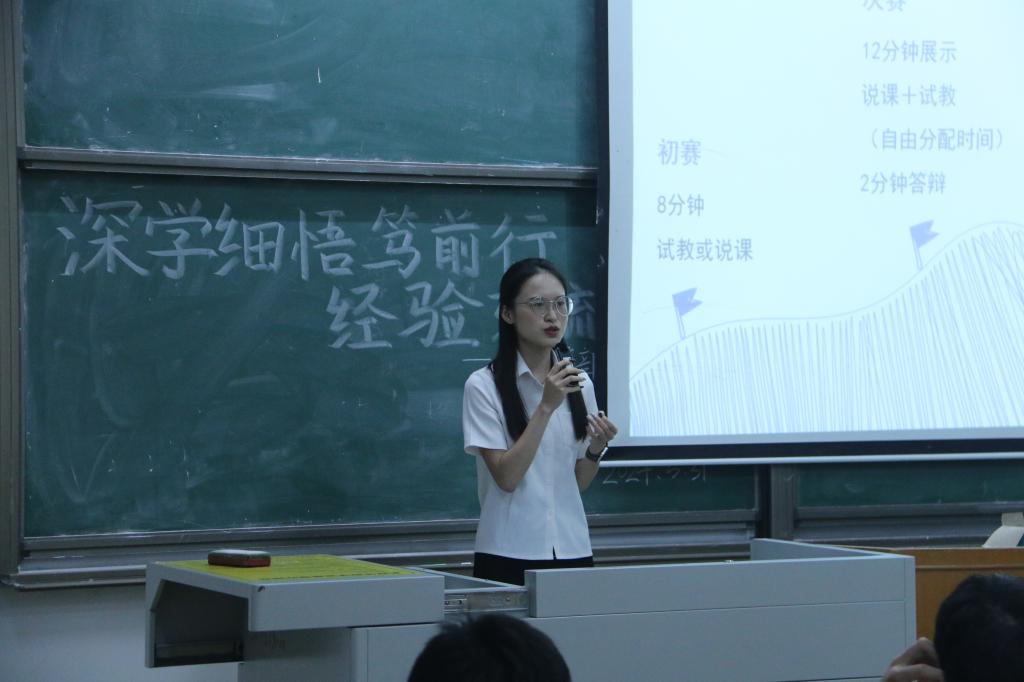 在省赛经验分享环节,李晓君以和大家聊天的形式回忆备赛过程进行分享,介绍了比赛流程、省赛准备工作等。她指出,要从日常学习生活中训练表现力,注重日常练习,可以多上台展示;要训练面对不同的交流的对象的时候,要有不同的表现的状态。要多留意身边儿童的生活,多看别人的展示,反思自己的不足之处。最后李晓君对想参加省赛的同学的忠告是不要保存实力,全力以赴,准备充分,注意细节。