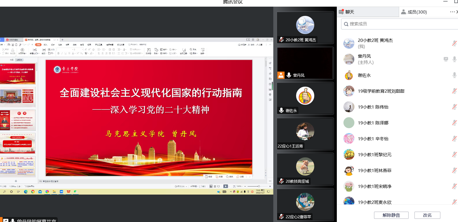 曾老师以“全面建设社会主义现代化国家的行动指南——学习党的二十大精神”为题,从过去五年的工作和新时代十年的伟大变革、开辟马克思主义中国化时代化新境界、新时代新征程中国共产党的使命任务、全面建设社会主义现代化国家的谋划安排、以党的自我革命引领社会革命五个方面开展宣讲。