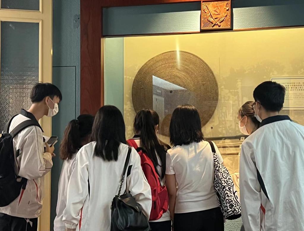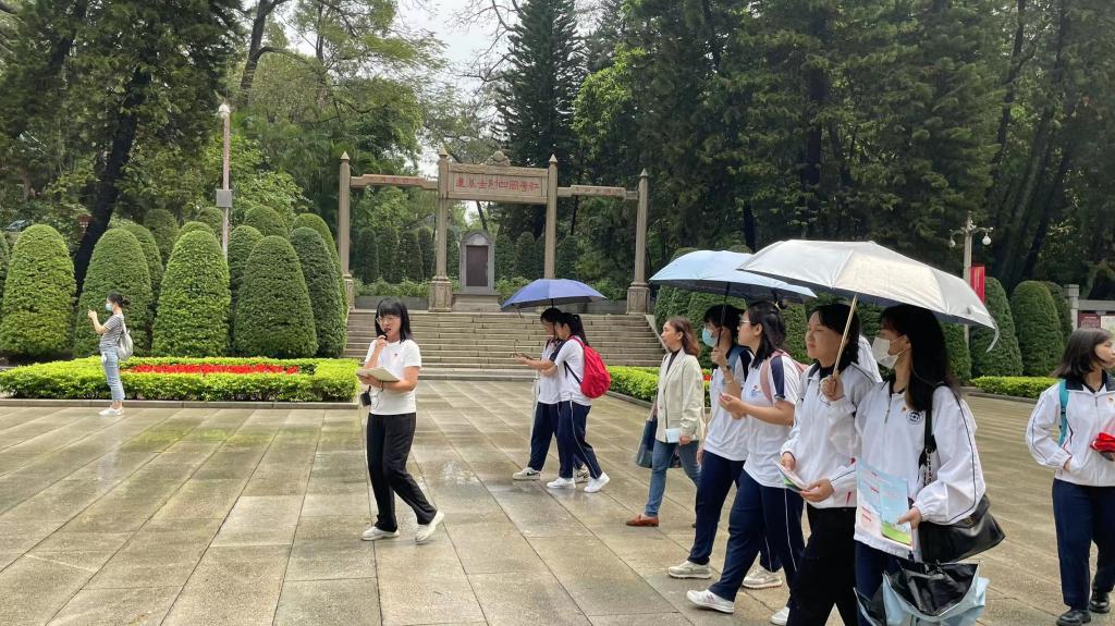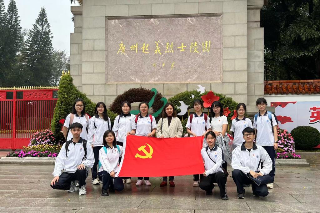 第二站,师生们来到了广州起义烈士陵园。走进大门,大道的尽头便是1987年为纪念广州起义60周年而建的广州起义烈士纪念碑,碑身正面镌刻着邓小平同志亲笔题词“广州起义烈士永垂不朽”。党员们跟着朋辈讲解员的指引,环绕纪念碑一周,并拾级而上,在松柏和木棉小路间穿梭,细细走访陵园,重温历史篇章,瞻仰了广州公社烈士之墓、叶剑英纪念碑、“刑场上的婚礼”雕像纪念广场等地。在广州公社烈士之墓前,全体学生党员在支部书记何秀华的带领下,重温入党誓词。陵园内的一花一草,一土一木无不在诉说当年那场英勇的起义。硝烟已散,枪炮声已远,但革命烈士的壮举和革命精神,早已烙在中华儿女的心中。