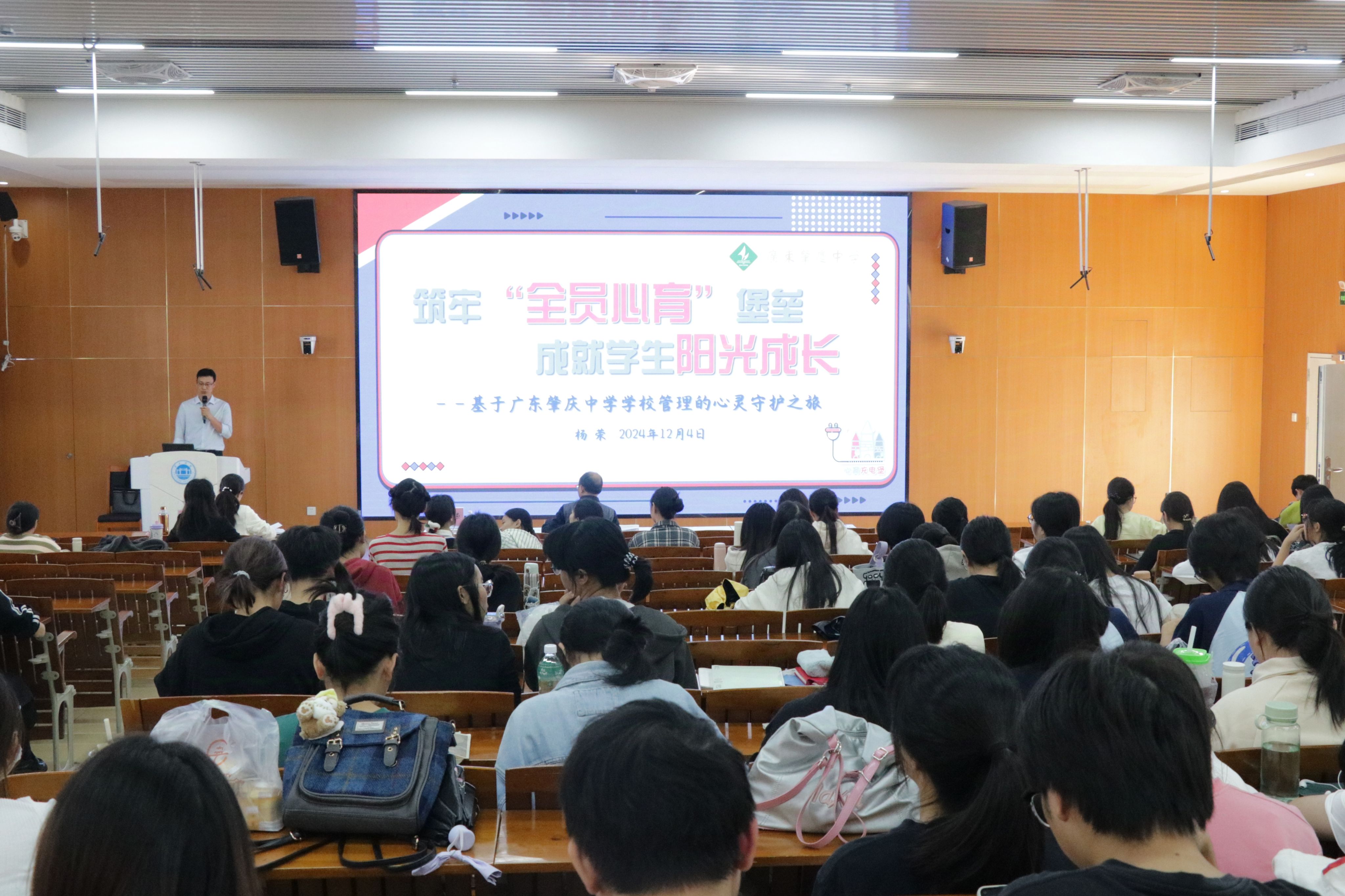 杨荣校长结合肇庆中学的管理和肇庆市的文化特色,提出要培养具有内心光芒的学生。他依据马斯洛需求层次理论,向在场同学们阐释了当代学生的多元化需求以及“心育”应具有的前瞻性。他特别指出,实现真正的“心育”,构建有效的机制,需要家庭、学校和社会三方的共同努力。同时,他强调,教师应关注青少年的全面多方位发展,要促进学生自我认知的成长,引导他们思考人生方向与意义,并塑造良好的价值观。青年教师更要守好“心育”底线,为青少年心理健康教育工作赋能,为青少年的阳光成长保驾护航。