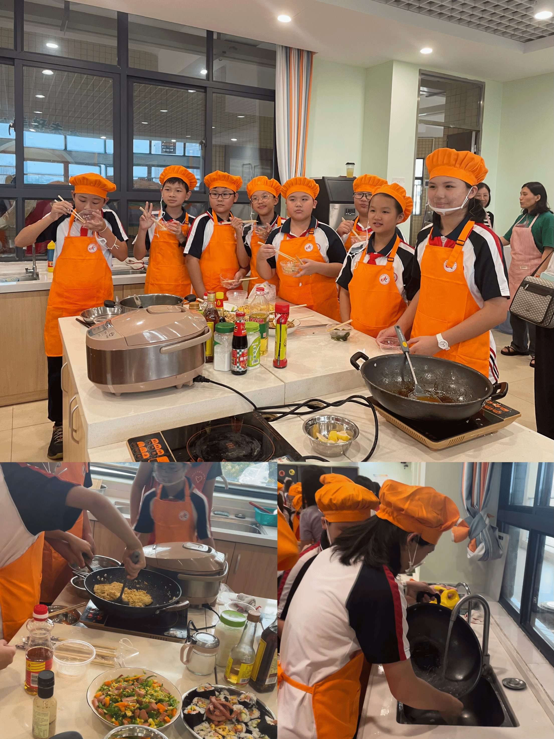 最后,六年级“学做一顿饭”的烹饪课尤其引人关注。教室里洋溢着欢声笑语和诱人的香气。同学们分成小组,在老师细心指导下开展实践活动。整个过程中,孩子们脸上始终挂着专注而愉悦的笑容,展现出对烹饪的满腔热情。看着自己亲手烹制的美食,孩子们感慨万千:“原来做一顿饭这么不容易!”这堂生动的实践课,让他们懂得了珍惜粮食、感恩父母的深刻道理。