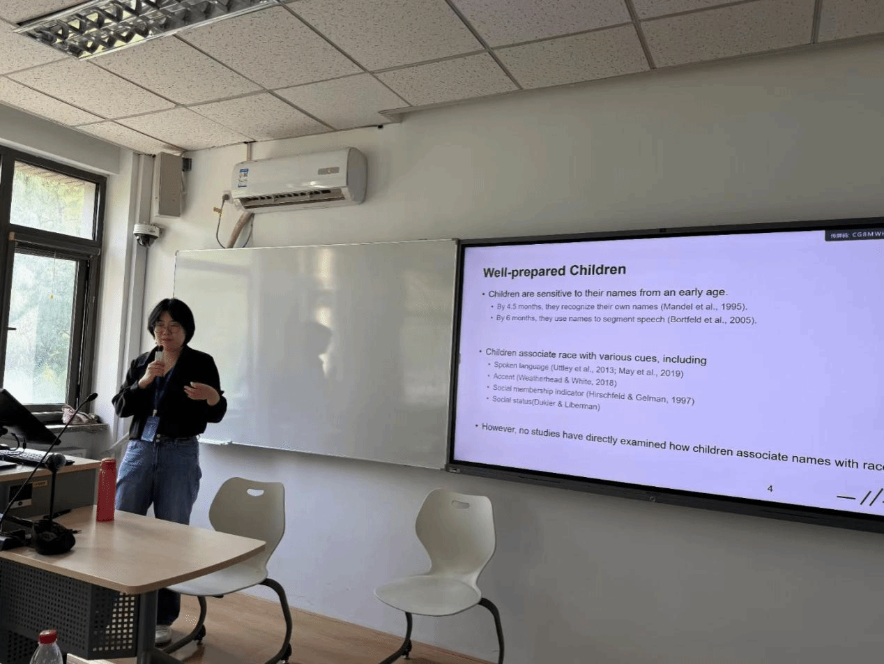 本次论坛汇集了国内外儿童认知发展、二语习得领域的专家学者,共同探讨少年儿童语言认知与跨文化发展的前沿议题。秦博洋分享了一项关于学龄前儿童如何通过名字推断种族的跨文化研究。研究通过实验揭示了不同文化背景下的儿童对名字隐含的社会信息(如种族、文化身份)的认知差异,并探讨了这种早期社会分类对儿童跨文化交际能力发展的潜在影响。该研究分享引起了与会学者的广泛兴趣和高度认可。在讨论环节,秦老师与来自重庆大学、北京外国语大学的学者就“儿童社会认知的可塑性”“名字在二语教学环境中的隐性作用”等问题展开了深入交流。