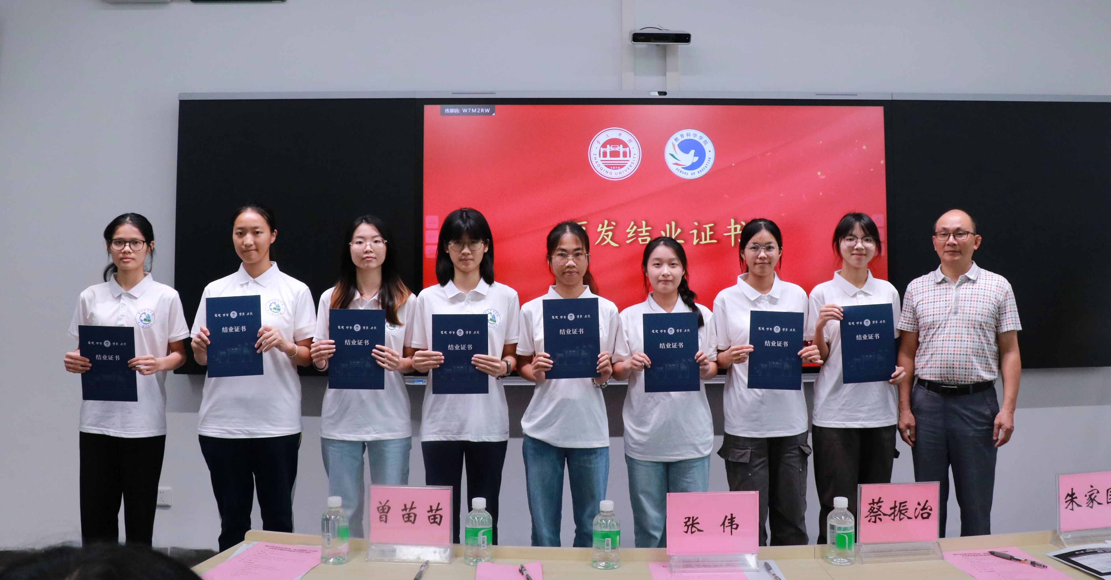 随后,领导为第一期“行知班”同学们颁发结业证书,见证学员们的阶段性成果。端州区教育局朱家国部长肯定了同学们的探索精神,指出资源开发需以教学需求为导向,结合AI技术优势迭代优化,建议关联教育理论、明确教师与资源开发者的角色定位。蔡振治书记在总结中向顺利结业的首期行知班同学们表示祝贺,向参与项目指导的导师、授课教师、班主任及支持项目的校内外专家致以感谢。同时,他对同学们之后的学习工作及第二期行知班的成员提出殷切期望,强调要传承“知行合一”的教育理念,不断努力向卓越教师的方向发展。